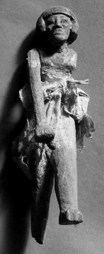 Single upright male figure. Cloth kilt. left arm missing, right extended and grasping. From model or boat. Height= 18.5 (cm) Width= 4 (cm). | |
