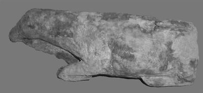 | GlobalEgMus: -- Model of a kneeling bull without horns - part of a larger model. Height=7.5 cm. length=21.8 cm. | |