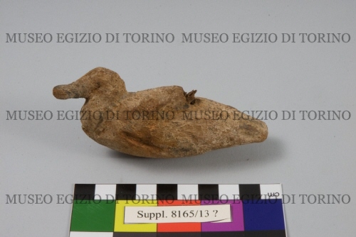 Turin Mus. online cat: Object: statue / duck Dimension: Height 4.8 cm., Width 3.5 cm., Length 11 cm. Material: wood / plaster / paint Provenance: Assiut Category: Statuary Location: Storage Description: Statuette of a duck stuccoed and painted, with a peg on the back for interlocking with the partially preserved hand of a bearer(?). The anatomical details are rendered graphically by means of painted stucco with black (feathers of the back, head and eye detail) and white (breast feathers), now only traces. -------------------------- This is one example of several similar fragments in Turin Schiaparelli excavated Asyut for the Turin Museum in the early 20th century, but he did not publish his excavations. | |
