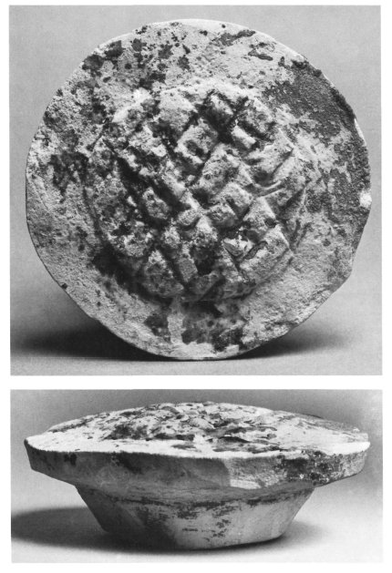 Tooley-1989 (p7) : Mastaba S790 at Giza belonging to Idw II (Junker 1947, 90 ff), with a serdab partially cutting into the mastaba of Idw I on the west side. ... Stone elements in the group included baskets and jars ----------------------------- This is a stone vessel from a part stone/part wooden model. Martin-Pardey-1977 (p. 152) interprets it as a plate of glowing coals for roasting food | |