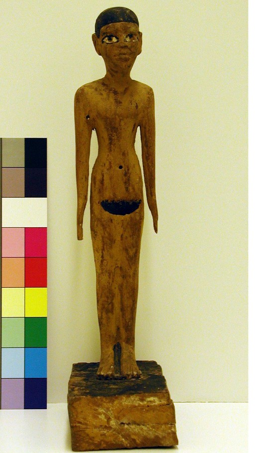 Hearst: Hearst web site: Wooden figure standing on wooden base [inv.: servant girl, nude, short hair, yellow skin, black pubic triangle] Tomb model Egypt, Cemetery 100; Tomb 43 (N43-20) Naga-ed-Der Cemetery 100 Wood, gesso, paint 280mm H | |