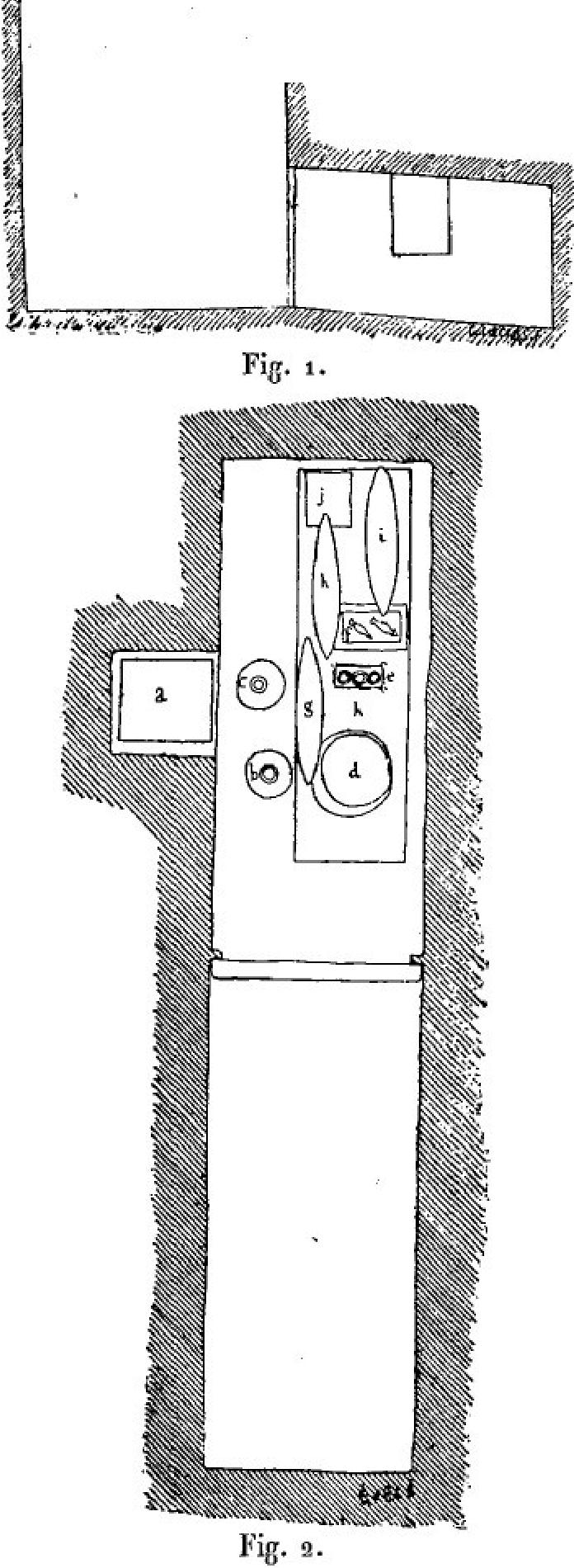 This chamber, located deeper than the northern chamber, had escaped ancient searches and was found absolutely intact, the door 1 m. 65 cm. high was blocked by four slabs, two of which were lying down and the others upright. The chamber is 2 m. 95 cm. long and 1 m. 95 cm. wide, its floor slightly sloping. In its eastern wall there is a niche 65 cm. wide and 68 cm. deep, placed 7 cm. above the floor and rising to the ceiling, which contained the canopic box. [...] The sarcophagus was pushed against the west wall of the chamber, [... most] of the funerary furnishings were placed on the lid of the sarcophagus as shown in the sketch [...]![]()
