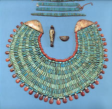 | In the burials of the rich, the mummy was decorated by a ritual collar and other jewelry. Gemniemhat's collar is made from green faience, carnelians, and wooden beads. |