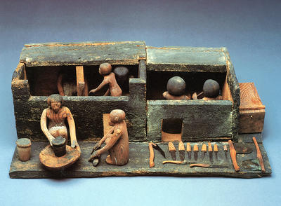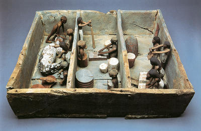 AEIN 1631 This model consists of three open yards. In two of these servants are grinding grain and making bread. In the third workers are slaughtering an ox and roasting a fowl. These are also typical scenes, often shown simply by servants singly or in small groups each on a simple board base. |