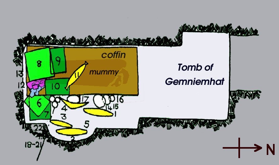 1-4 Boats 5 Whetstone 6 Brewery 7 Granary 8 Kitchen 9 Weaving 10 Workshop/barbers 11 Boat 12 Statues of Gemniemhat 13 Offering bearers 14 Bowl with calf bones 15 Smaller bowl 16 Saucer 17-21 jars 22 Canopic chests |