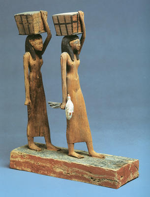 AEIN 1628 The standard complement of tomb models included female offering bearers. In some cases there were elaborate processions of such servants. Gemniemhat had the normal pair, but their workmanship is very good. Both are women carrying baskets on their heads and one grasps a bird by its wings. |