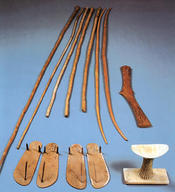 The assemblage of goods in a Middle Kingdom burial of a high status individual included a pair of sandals, a headrest and a number of wooden staves. In the case of Gemniemhat there were two pairs of sandals, and also some wooden bows as well as staves, and a throw-stick. |
